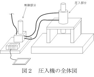 図2に示しているのは、実際に設計した圧入機の概要図です。後述する仕様や検討を重ねた結果、圧入を行う圧入部分と、油圧や制御機器等をまとめた制御部分とに分けて構成しました。設備の移動やメンテナンス性を考えて極力ユニット化しています。では、実際に図2に示す圧入機を例に設計をしていきましょう。