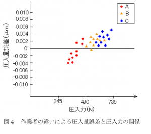 この工程では、圧入する部品を治具にセットし、上方からハンドプレスで圧力を掛けることで圧入を行っています。図4は、複数の作業者による圧入量の誤差と圧入力の関係を示しています。