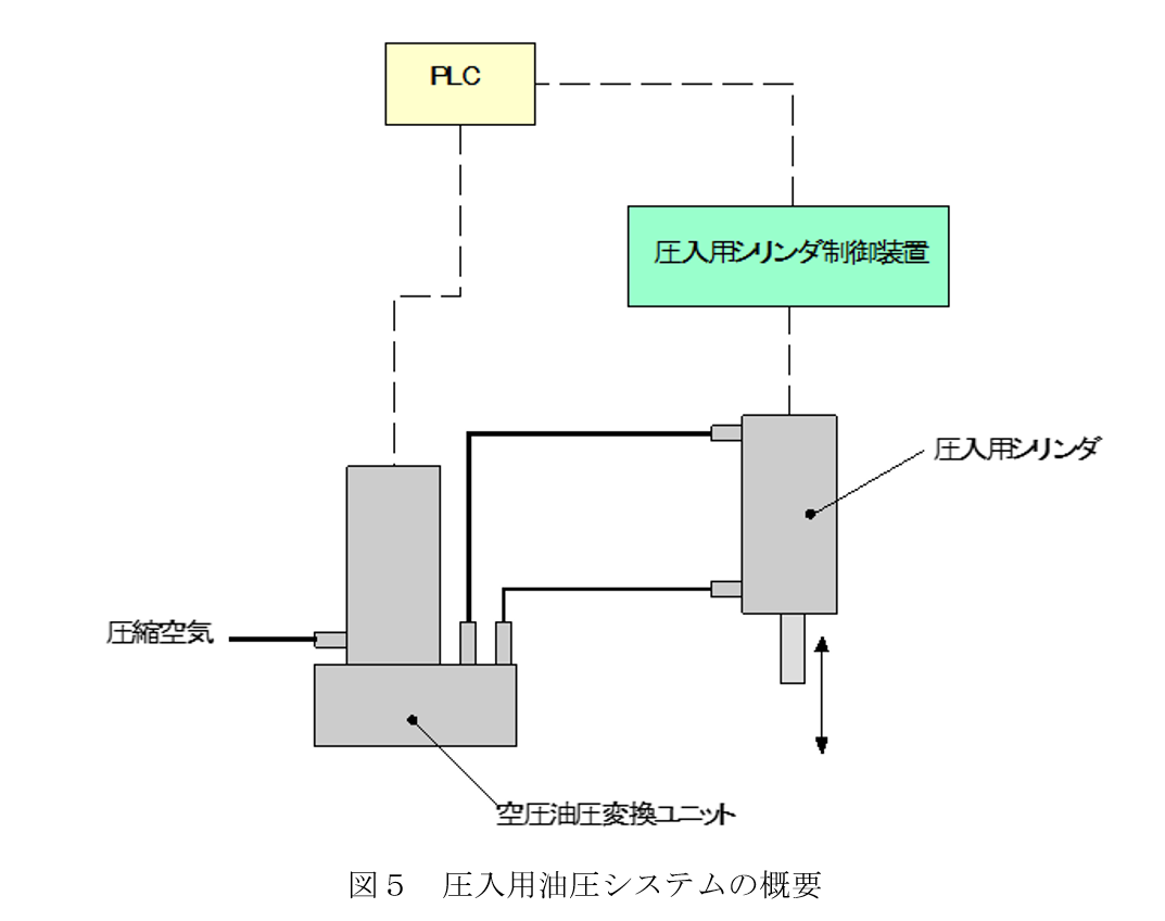 図5に示すように空圧油圧変換ユニットと、圧入用シリンダ及び圧入用シリンダ制御装置からなる圧入管理システムと、PLCを組み合わせることで圧入用の油圧システムをシンプルに構成することができます。