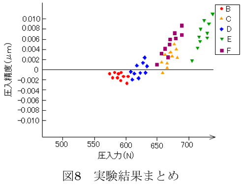 図8のグラフを見ると、圧入力が増大するとともに圧入精度が+寄り、つまり圧入する側の部品が圧入される側の部品に対して規定通りに圧入できていない傾向にあることがわかります。