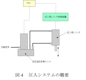 圧入システムを構成する上で最小の構成が図4の構成です。具体的には、圧入用シリンダ、圧入用シリンダ制御装置、空圧油圧変換ユニットおよびこれらのユニットを制御するPLCです。これに必要な構成を加えていきます。