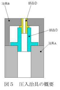 次に条件(2)複数の部品の組み合わせ(約50種類程度)において問題なく圧入ができることについて確認します。現場では、複数の圧入治具を組み合わせて様々な部品同士を圧入させていることを確認しました。具体的には、図5に示すように圧入治具A、圧入治具B、部品①及び部品②の組み合わせを変更することで多様な部品の圧入を実現しています。