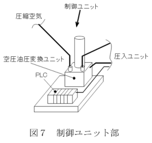 そこで、図6に示す圧入作業を行う部分のみをまとめた圧入ユニット部と、空圧油圧変換ユニットやPLC等をまとめた、図7に示す制御ユニット部とに分けた構成としました。これにより、最も重い圧入ユニット部の重量を40kg程度に抑えることができ、制御ユニット部も空圧油圧変換ユニットに油を入れた状態でも30kg以下となり、それぞれ成人男性2人程度で運ぶことができるので、条件(5)を満たします。
