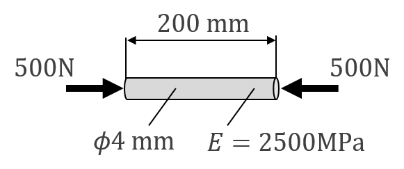 次に圧縮荷重の強度計算をしてみましょう。引張荷重と同様に丸棒に圧縮荷重が与えられた場合で考えます(図3)。