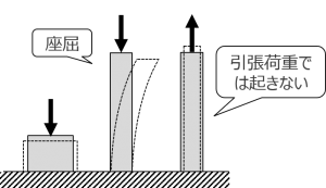 引張荷重と圧縮荷重の計算方法は全く同じですが、符号が変わることに注意しましょう。圧縮荷重を計算する際に、もうひとつ注意しなければならないことがあります。それは座屈です(図4)。プラスチック製の定規を引っ張っても、人の力で破断させることはできませんが、圧縮方向に力を加えると、大きく湾曲し、人の力でも壊すことができます。このように、細長い物体に圧縮荷重を加えたとき、大きく変形する現象を座屈といいます。座屈は細長い物体に圧縮荷重を加えたときに生じる現象で、太くて短い物体や引張荷重では起きません。また、座屈は縦弾性係数が小さいほど発生しやすい現象です。したがって、プラスチックは、金属に比べて座屈が起きやすい材料だといえます。