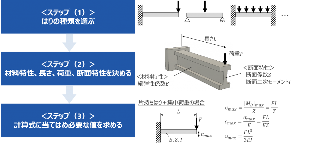 図5のように、3つのステップに分けて考えることによって、はりの強度計算ができるようになります。