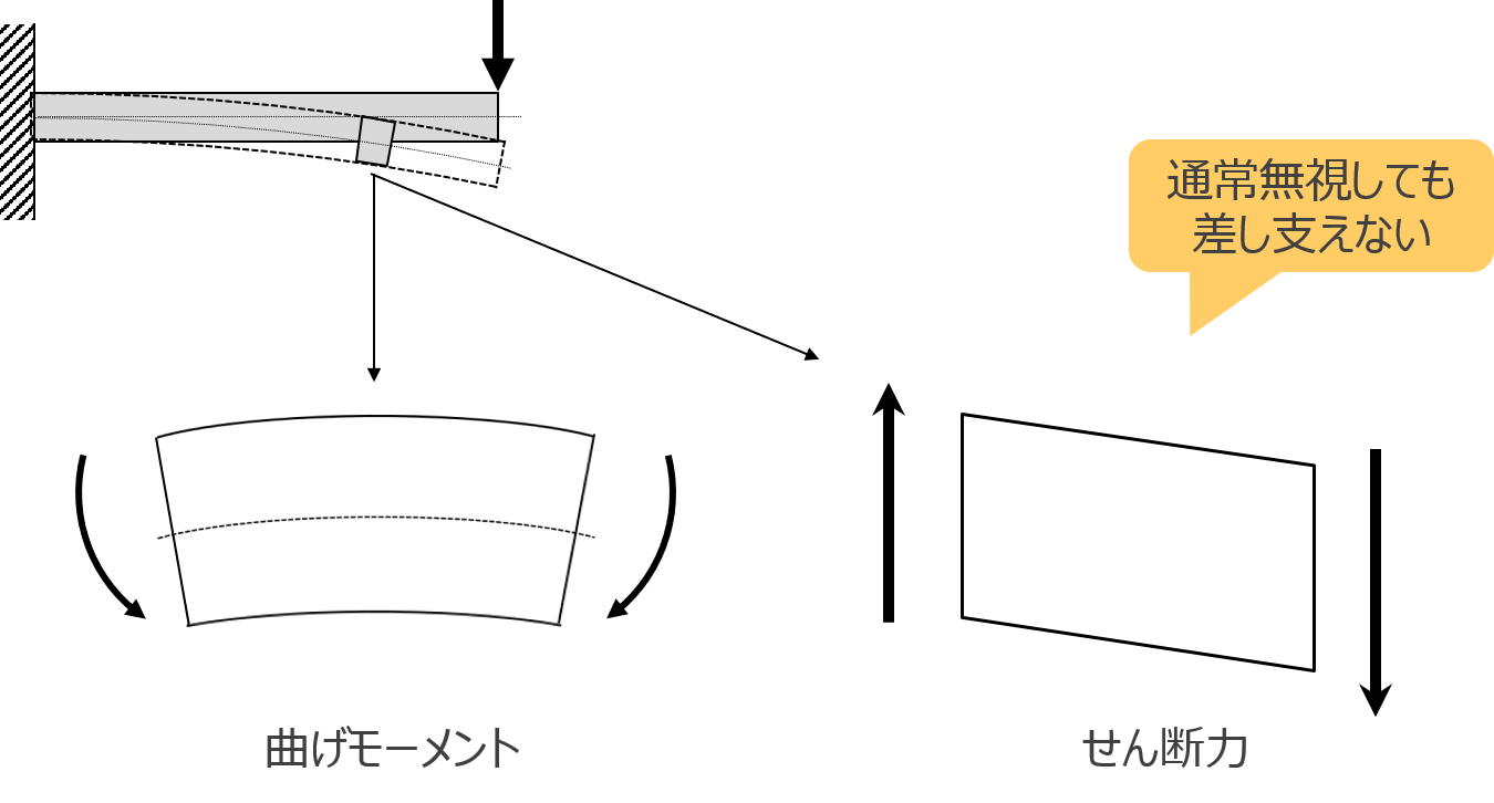 図7のようにはりの一部を取り出して考えたとき、その部分には曲げモーメントとせん断力が生じています。はりの強度計算を行う場合、せん断力の影響は非常に小さいため、厳密な計算を行う場合や、はりが極端に短い場合を除き無視しても構いません。したがって、はりの強度計算では曲げモーメントに着目し、曲げモーメントによって応力やたわみが発生すると考えます。