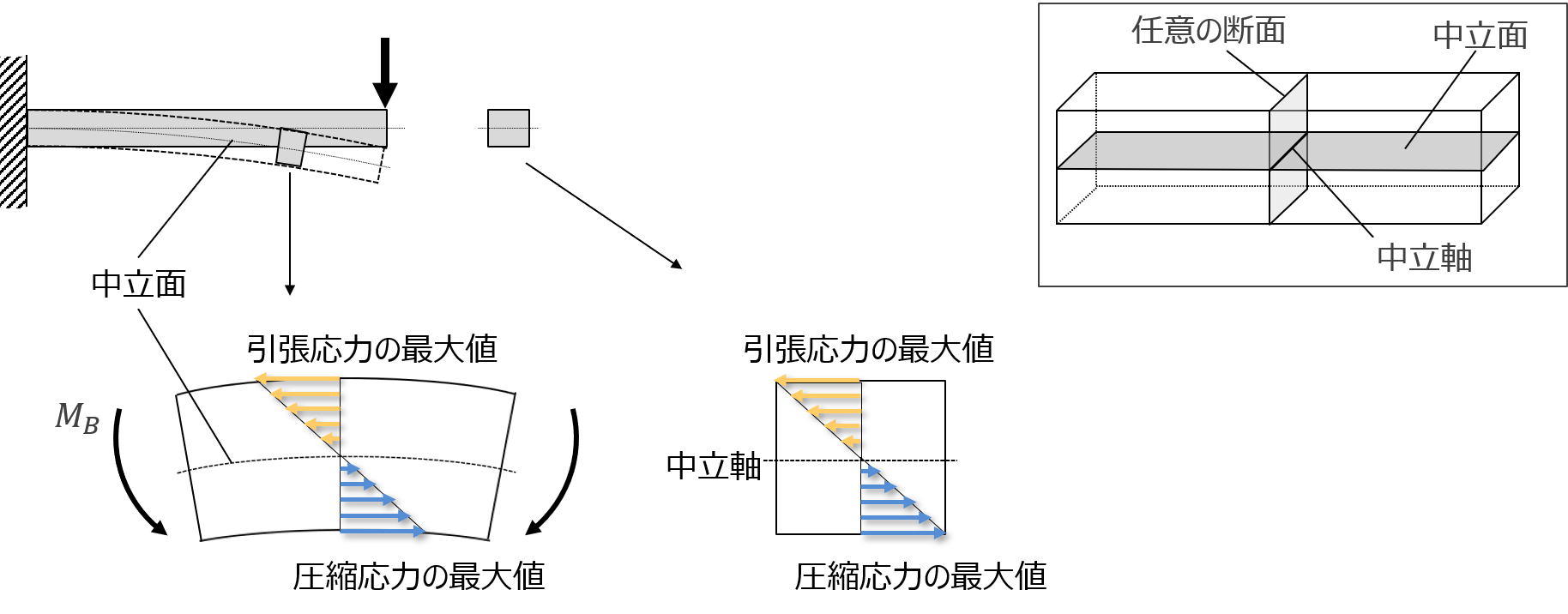 図8の向きに曲げモーメント\(M_B \) が作用すると、はりの上面は引っ張られて伸び、下面は圧縮されて縮みます。はりの中央付近には伸びも縮みもせず、応力も生じない面が存在します。この面のことを中立面といいます。また、はりの任意の断面と中立面の交線を中立軸といいます。中立軸は断面の図心(重心)を通ります。中立面から外側に行くほど応力は大きくなり、上面の一番外側で引張応力の最大値、下面の一番外側で圧縮応力の最大値となります。このように曲げモーメントが作用することによって生じる引張応力と圧縮応力のことを曲げ応力といいます。曲げ応力という全く別の応力があるわけではありません。