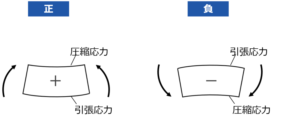 曲げモーメントは下側が引張応力になる方向と、上側が引張応力になる方向の2つが存在します。引張応力と圧縮応力はいずれも垂直応力ですが、多くの材料が引張と圧縮では特性が異なるため、どちらの応力が生じているかを把握しておく必要があります。そこで、下側が引張応力になる方向を正、上側が引張応力になる方向を負と約束することにします(本稿における約束)。