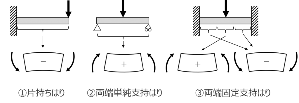 この約束にしたがって、実際のはりにどのような曲げモーメントが生じているのかを見てみましょう。図10の①のように片持ちはりの先端に集中荷重が加えられた場合、全体に渡って上側に引張応力が生じることは容易にイメージできると思います。したがって、曲げモーメントは全体に渡って負となります。②の両端単純支持の場合は、片持ちはりの反対で下側全体が引張応力になります。つまり、曲げモーメントは全体に渡って正です。③の両端固定支持の場合は少し複雑です。中央部分は下側に引張応力が生じ、両端部分では上側に引張応力が生じます。したがって、曲げモーメントは中央部分で正、両端部分で負となります。
