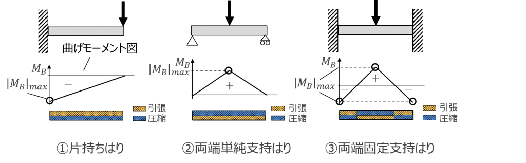 シンプルなはりであれば、曲げモーメントの向きはすぐに分かります。しかし、荷重が複数あるなど、複雑になってくると少し難しくなります。また、曲げモーメントの向きだけではなく、はりのどの部分で大きな曲げモーメントが生じているかも把握する必要があります。そこで、はりに生じる曲げモーメントの様子を分かりやすく示した曲げモーメント図を利用します(図11)。片持ちはりの場合、全体に渡って曲げモーメントが負であることは前述した通りですが、曲げモーメント図を見ると、固定端(壁部分)で負の最大値、先端でゼロになることが分かります。両端単純支持のはりの場合は、両端がゼロで、中央部分で最大です。両端固定支持のはりの場合は、中央部分が正の最大値、両端が負の最大値となります。正の最大値と負の最大値の間には曲げモーメントがゼロになる部分があることが曲げモーメント図から見て取れます。