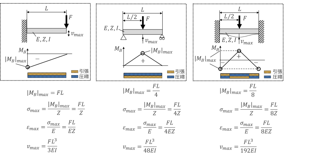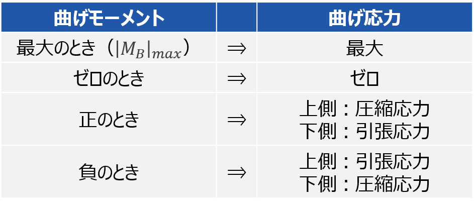 曲げモーメント図を読み取る際のポイントを図12にまとめています。はりの強度計算をするときに最も重要な値である最大応力は、最大曲げモーメント\(|M_B|_{max} \) の位置で生じます。\(|M_B|_{max} \) は教科書などに載っている公式を利用します。曲げ応力は曲げモーメントによって生じますので、曲げモーメントがゼロの部分は曲げ応力もゼロとなります。曲げモーメントが正の部分では下側に引張応力が、負の部分では上側に引張応力が生じています。