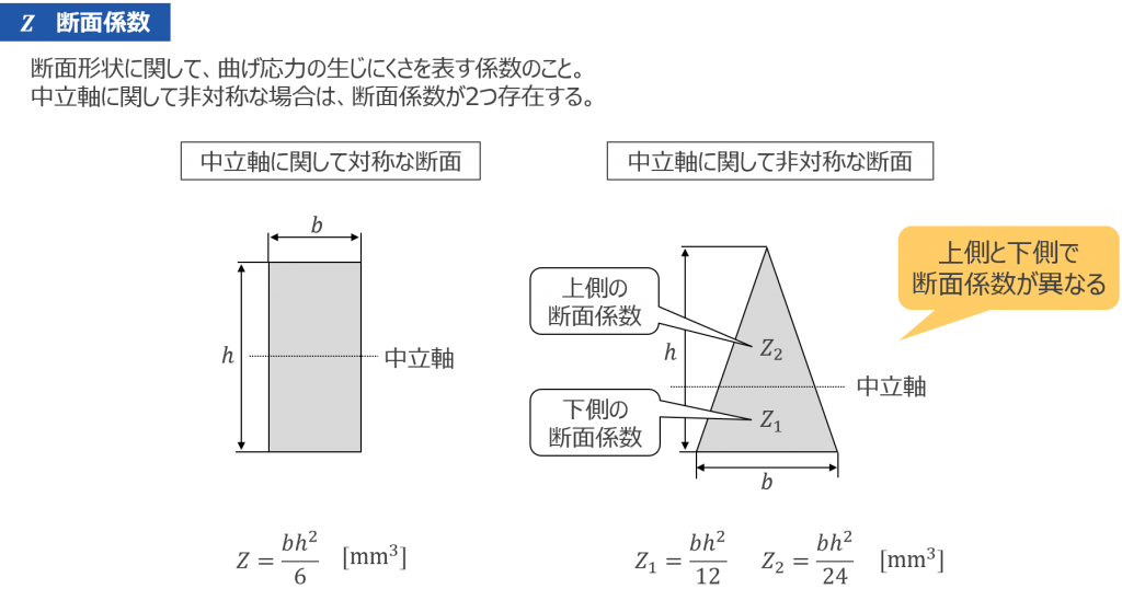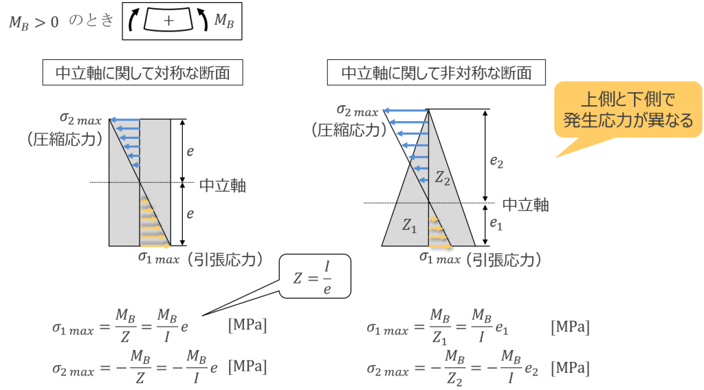 次に中立軸に関して非対称な三角形断面について見てみましょう。中立軸に対して非対称な断面では、断面係数は上側と下側で異なります。上側の応力を計算する際には上側の断面係数、下側の応力は下側の断面係数を使用しなければなりません。三角形断面の場合、断面係数は\(Z_1 = 2Z_2 \) ですので、発生応力は上側が下側の2倍の大きさになることを示しています。
