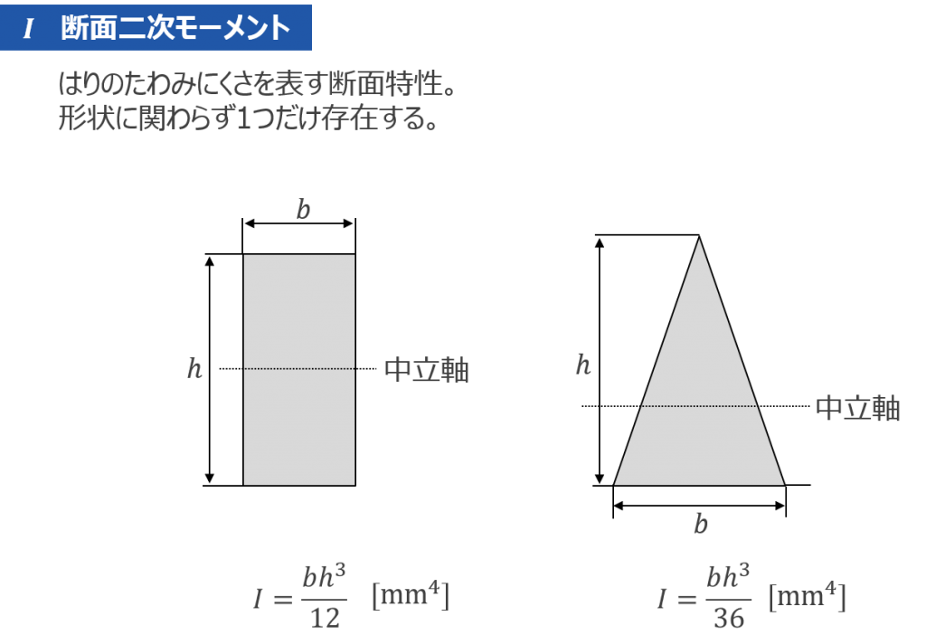 はりに生じる応力と同様に、たわみも断面形状に大きな影響を受けます。はりのたわみにくさを表す断面特性が断面二次モーメントIです。他の条件が同じであれば、断面二次モーメントが大きいほど、はりはたわみにくくなります。ここでも長方形断面と三角形断面について見ていきましょう。断面係数と異なり、断面二次モーメントは中立軸に関して対称でも非対称でも1つしか存在しません。断面係数と同様に幅方向\(b \) を大きくするよりも、高さ方向\(h \) を大きくした方が、効果が大きいことが分かります。断面係数の場合は、高さの2乗で効いていましたが、断面二次モーメントの場合は高さの3乗で効いてきますので、非常に大きな影響を受けます。プラスチック製の定規を曲げるとき、曲げる方向によって曲がりにくさが全く異なるのはこのためです。