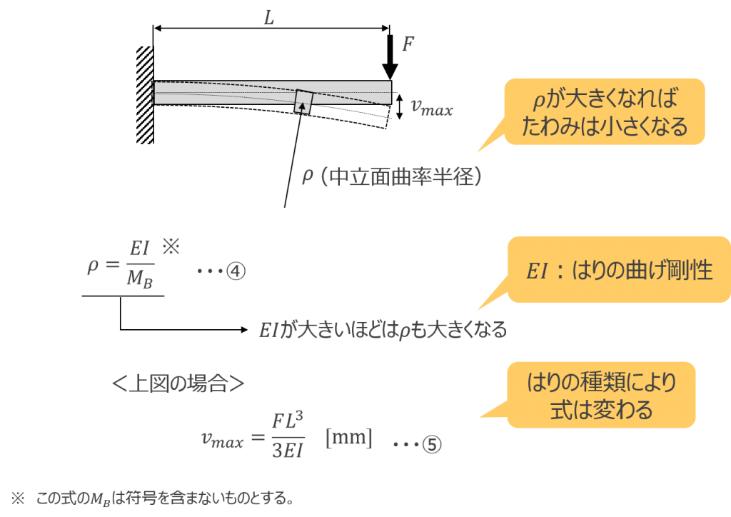 はりは曲げ荷重を受けると曲線を描いて変形します。中立面が描く曲線の曲率半径を とすると、図16の式④のように表すことができます。 \(\rho\) が大きくなるということはたわみが小さくなることを意味しますので、曲げモーメント\(M_B\) が同じであれば、 \(EI\) が大きいほどたわみにくいはりだといえます。このときの \(EI\) をはりの曲げ剛性といいます。たわみにくいはりにするためには、縦弾性係数 \(E\) の大きな材料を使用する、断面二次モーメント \(I\) の大きな形状にする、あるいはその両方を組合せて対応します。式の導出は省きますが、式④の関係式から、はりの種類に応じたたわみ量の式を導くことができます。図16の片持ちはりの場合は式⑤のようになり、やはり式の中に曲げ剛性を示す \(EI\) が含まれています。
