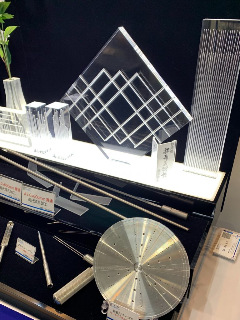 元来、小銃や猟銃など穴をあけるために開発されたことから名付けられたというガンドリル加工。ガンドリルマシンを自社開発しているとのことで、ブース内に所狭しと並べられた様々なサンプルは圧巻でした。