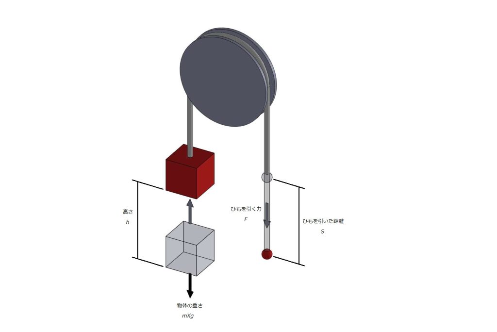 滑車を使って物体をある高さ【h】まで持ち上げるときの仕事【W】です。