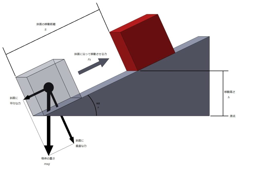 物体をある高さ【h】まで持ち上げるときに、角度【θ】の付いた斜面に沿って移動させる場合の仕事【W】です。
