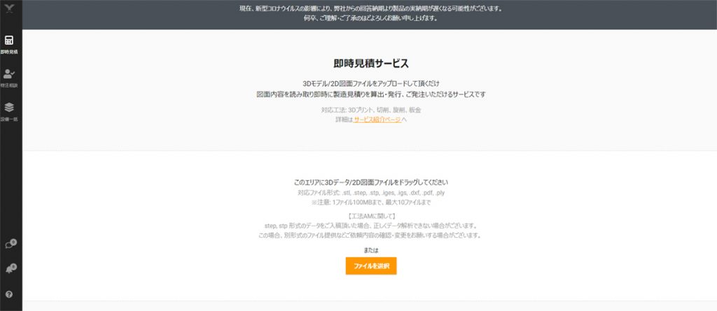 即時見積サービスの画面が開いたら画面下部の「ファイルを選択」ボタンを押して先ほどDSMechで作成したSTLファイルを選び、アップロードをします。