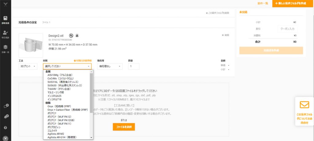 ファイルをアップロード出来たら「工法」のプルダウンから3Dプリント、「材質」のプルダウンから望みの材質を選択します。すると5秒ほどで3Dデータが解析されて画面右側に金額が表示されます。