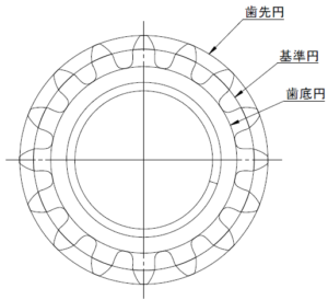 歯底円 (Dedendum Circle): 歯の谷底の円で、細い実線で描きます。