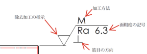 例:切削、研削、研磨など。何らかの除去加工によって面を仕上げる必要があることを示します。具体的な粗さ値が指示されない場合は、通常の機械加工で得られる程度の仕上げを意味します。
