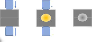 接合する金属板を重ねて電極で挟み、圧力をかけながら電流により加熱することで接合します。