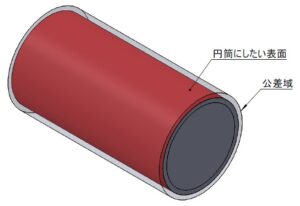 例えば回転軸と軸受けのような、正確な円の形状が欲しい部品に対して歪みなどによる乱れの許容範囲を設定します。